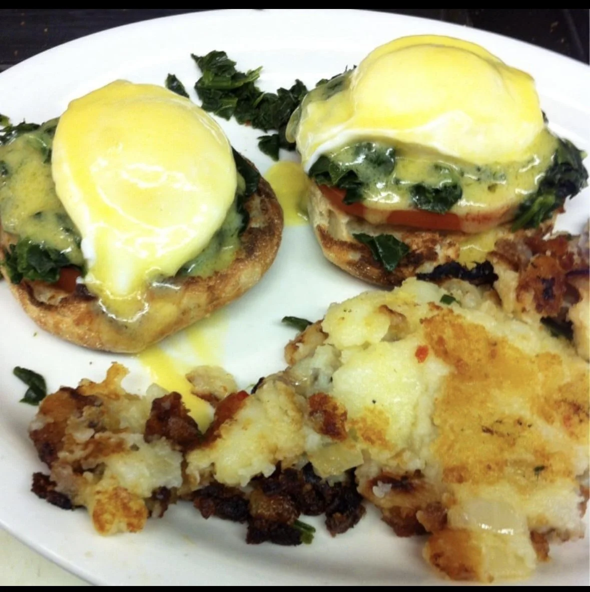 Eggs Florentine – Two Eggs Over Easy over Spinach, Tomatoes & English Muffin with Hollandaise Sauce & Homefries – $15.95